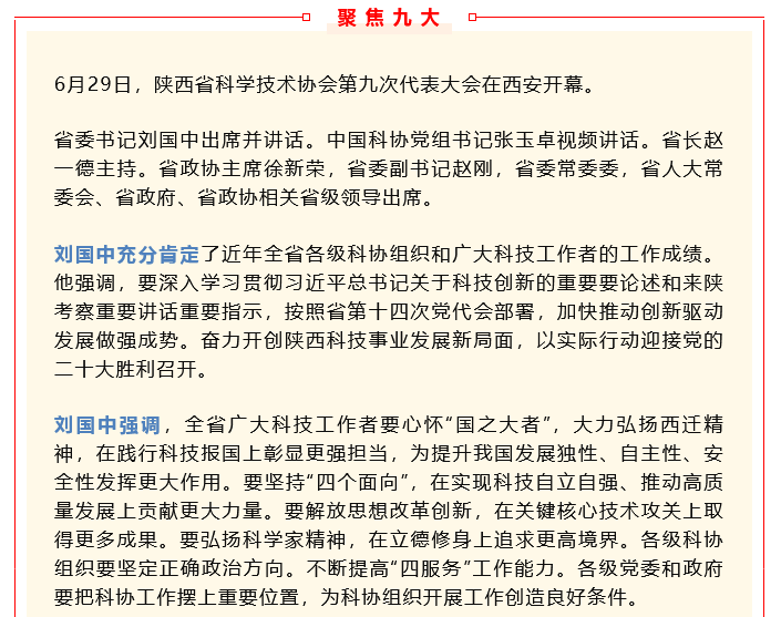 6月29日,陜西省科學(xué)技術(shù)協(xié)會第九次代表大會在西安開幕。省委書記劉國中出席并講話。中國科協(xié)黨組書記張玉卓視頻講話。省長趙一德主持。省政協(xié)主席徐新榮,省委副書記趙剛,省委常委委...